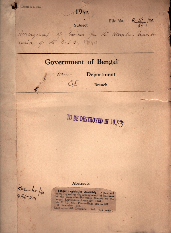 | Rack No. 08, Bundle No. 17; SI No. 1068 Bye-election in the Bengal Chamber of commerce constituency of the B.L.A. Via Mr. F.H. French, resigned. | Rack No. 08, Bundle No. 17; SI No. 1069 Bye-election in the B.L.C. Vice E.C. Ormond. | Rack No. 08, Bundle No. 17; SI No. 1070 Appointment of Sir Henry Twynam as the Governor of the C.P. & Berar. | Rack No. 08, Bundle No. 17; SI No. 1071 Arrangement of business for the November December Session of the B.L.A., 1940. | Rack No. 08, Bundle No. 17; SI No. 1072 Payment of washing charges for the liveries supplied to certain record suppliers of the B.L.A. Department for duty within the Legislative Chamber. | Rack No. 08, Bundle No. 17; SI No. 1073 Primary election for the purpose of Chorten an electoral College for the Railway Trade Union (Labour) Constituency of the B.L.A. | Rack No. 08, Bundle No. 17; SI No. 1074 A.Q. by Mr. Atul Chandra Kumar, M.L.A. regarding the number of Voters on the electoral rolls of the Various Constituencies of the B.L.A. |