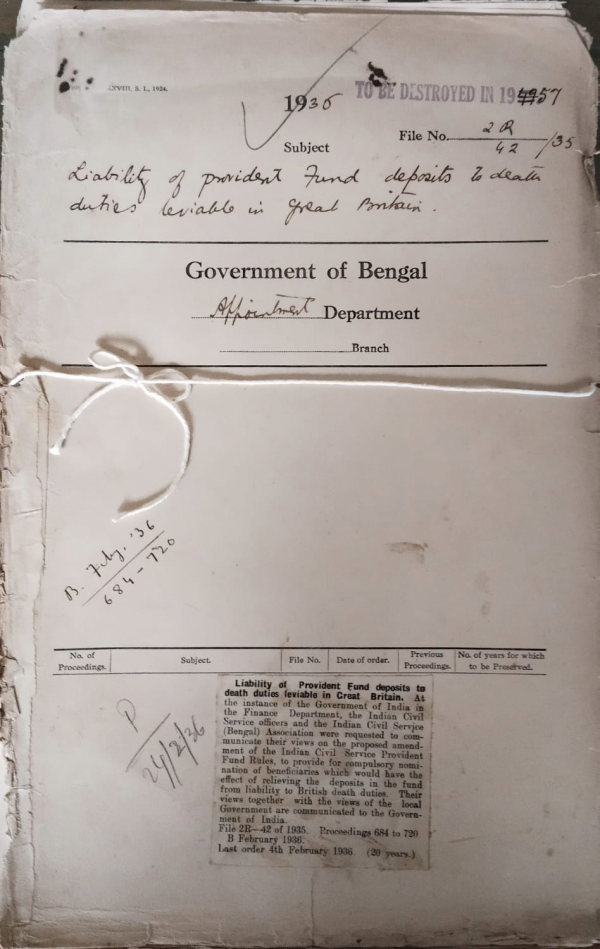 | Rack No. 2, Bundle No. 27, Sl No. 1603 Extension of the Appointment of Mr. S.N. Gupta C.E., I.C.S. Indian trade commission Hamburgh. | Rack No. 2, Bundle No. 27, Sl No. 1604 Representation from the member of the depressed section of the Muhammad Community for recruitment of Government officers. | Rack No. 2, Bundle No. 27, Sl No. 1605 Grant of new and to Mr. W.J. Palmer, I.C.S. S.D.O. Kalimpong, Darjeeling. | Rack No. 2, Bundle No. 27, Sl No. 1606 Liability of provident fund deposits to death duties livable to death duties livable in Great Britain. | Rack No. 2, Bundle No. 27, Sl No. 1607 List of Retrenched personnel considered fit for re-employment. | Rack No. 2, Bundle No. 27, Sl No. 1608 Summary powers of Molvi Abdul Aziz, Deputy-Magistrate Bagerhat, Khulna. | Rack No. 2, Bundle No. 27, Sl No. 1609 Supply of civil list to the New york Public library. |
