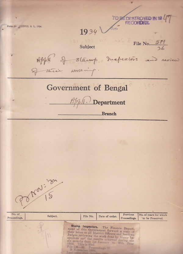 | Rack No. 02, Bundle No. 18, Sl No. 1051 Participation of Staff employed by various local bodies in elections to legislatures. | Rack No. 02, Bundle No. 18, Sl No. 1052 T.A. of A.M. Ahmed, District & Sen, Judge from Rangpur to Calcutta. | Rack No. 02, Bundle No. 18, Sl No. 1053 Application of Rai Kalipada Bahadur, S.D.O. Munshiganj for an advance from G.P. Fund. | Rack No. 02, Bundle No. 18, Sl No. 1054 Appointment of Stamp inspectors and review of their works. | Rack No. 02, Bundle No. 18, Sl No. 1055 Advance to Mr. E.S. Simpson, I.C.S. from the provident Fund. | Rack No. 02, Bundle No. 18, Sl No. 1056 Appointment of inspector of Salt + Excise. | Rack No. 02, Bundle No. 18, Sl No. 1057 Cancellation of leave of Mr. Nitai Gopal Singh, Superintendent Special Jail, Dum Dum. |