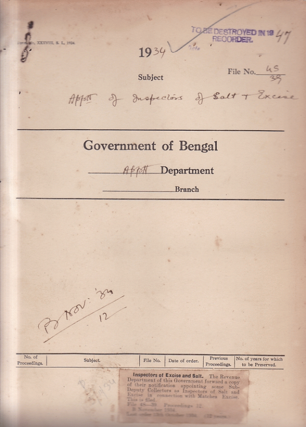 | Rack No. 02, Bundle No. 18, Sl No. 1053 Application of Rai Kalipada Bahadur, S.D.O. Munshiganj for an advance from G.P. Fund. | Rack No. 02, Bundle No. 18, Sl No. 1054 Appointment of Stamp inspectors and review of their works. | Rack No. 02, Bundle No. 18, Sl No. 1055 Advance to Mr. E.S. Simpson, I.C.S. from the provident Fund. | Rack No. 02, Bundle No. 18, Sl No. 1056 Appointment of inspector of Salt + Excise. | Rack No. 02, Bundle No. 18, Sl No. 1057 Cancellation of leave of Mr. Nitai Gopal Singh, Superintendent Special Jail, Dum Dum. | Rack No. 02, Bundle No. 18, Sl No. 1058 Conduct of an exam of a candidate at the instance of the High Commissioner for India on behalf of the Chartered Inst. of Secretaries, London. | Rack No. 02, Bundle No. 18, Sl No. 1059 Appointment of returning officers, Registering Authorities & Revising officers for elections under the new constitution. |