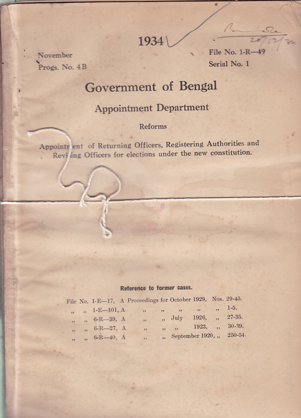 | Rack No. 02, Bundle No. 18, Sl No. 1056 Appointment of inspector of Salt + Excise. | Rack No. 02, Bundle No. 18, Sl No. 1057 Cancellation of leave of Mr. Nitai Gopal Singh, Superintendent Special Jail, Dum Dum. | Rack No. 02, Bundle No. 18, Sl No. 1058 Conduct of an exam of a candidate at the instance of the High Commissioner for India on behalf of the Chartered Inst. of Secretaries, London. | Rack No. 02, Bundle No. 18, Sl No. 1059 Appointment of returning officers, Registering Authorities & Revising officers for elections under the new constitution. | Rack No. 02, Bundle No. 18, Sl No. 1060 Representation of women in the provincial lower House. | Rack No. 02, Bundle No. 18, Sl No. 1061 Compliant against the conduct and removal from the service of Babu Nirod Mohan Chakrabarti. | Rack No. 02, Bundle No. 18, Sl No. 1062 Application of Babu Gopal Chandra Dutta for admission to the I.C.S. Exam 1935. |