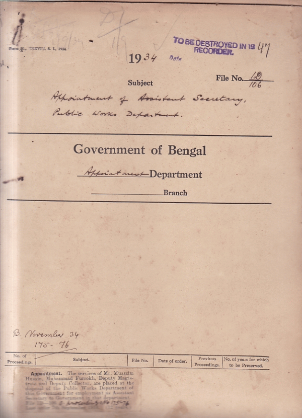 | Rack No. 02, Bundle No. 18, Sl No. 1066 Posting of Mr. A.K.M. Hafizuddin, A.S.P. , I.P. | Rack No. 02, Bundle No. 18, Sl No. 1067 Inspection of chemical courts at Satkhira by the Sessionions Judge of Khulna. | Rack No. 02, Bundle No. 18, Sl No. 1068 Provision for the renewal of altar linen of the military church at Lebong. | Rack No. 02, Bundle No. 18, Sl No. 1069 Appointment of Assistant Secretary, P.W. Department. | Rack No. 02, Bundle No. 18, Sl No. 1070 Vacation leave of Judge & Arrangements. | Rack No. 02, Bundle No. 18, Sl No. 1071 Report on death of Mr. S.M. Kadri, I.C.S. Assistant Magistrate + Collector, Murshidabad. | Rack No. 02, Bundle No. 18, Sl No. 1072 Appointment of the Revd. A.G. Cowham, as a Chaplain of Barrackpore. |
