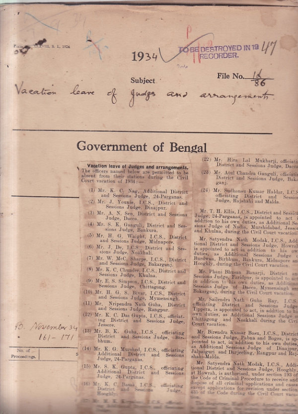 | Rack No. 02, Bundle No. 18, Sl No. 1067 Inspection of chemical courts at Satkhira by the Sessionions Judge of Khulna. | Rack No. 02, Bundle No. 18, Sl No. 1068 Provision for the renewal of altar linen of the military church at Lebong. | Rack No. 02, Bundle No. 18, Sl No. 1069 Appointment of Assistant Secretary, P.W. Department. | Rack No. 02, Bundle No. 18, Sl No. 1070 Vacation leave of Judge & Arrangements. | Rack No. 02, Bundle No. 18, Sl No. 1071 Report on death of Mr. S.M. Kadri, I.C.S. Assistant Magistrate + Collector, Murshidabad. | Rack No. 02, Bundle No. 18, Sl No. 1072 Appointment of the Revd. A.G. Cowham, as a Chaplain of Barrackpore. | Rack No. 02, Bundle No. 18, Sl No. 1073 Cancellation of leave of Maulvi Molla Abdul Majid, Sadar, S.D.O. Faridpur. |