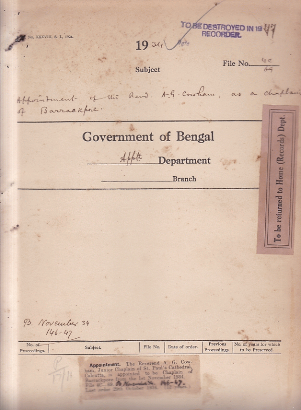 Appointment of the Revd. A.G. Cowham, as a Chaplain of Barrackpore.