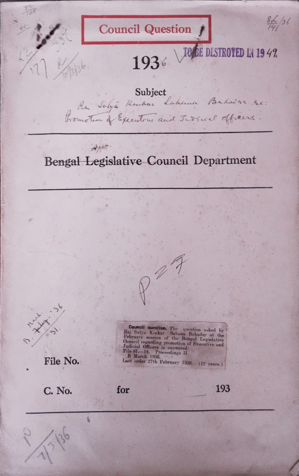 | Rack No. 2, Bundle No. 27, Sl No. 1609 Supply of civil list to the New york Public library. | Rack No. 2, Bundle No. 27, Sl No. 1610 Suggestion that Advisory Committees formed by Universities to advise prospectus to advise prospective candidates for the I.C.S. Should be utilized for advising candidates. | Rack No. 2, Bundle No. 28, Sl No. 1610 Proposed transfer of certain parson-ages to the Indian Church. | Rack No. 2, Bundle No. 28, Sl No. 1611 Rai Stya Kinkar Sahana Bahadur Promotion of executive and Judicial officers. | Rack No. 2, Bundle No. 28, Sl No. 1612 Appointment of Sub-Deputy Collector as inspectors of Matches. | Rack No. 2, Bundle No. 28, Sl No. 1614 Expenditure increase by the Collector of Tippera in connection with preparation of electoral rolls. | Rack No. 2, Bundle No. 28, Sl No. 1615 Europeans seat in the Federal Assembly. |