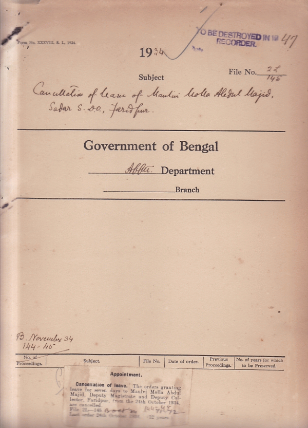 Cancellation of leave of Maulvi Molla Abdul Majid, Sadar, S.D.O. Faridpur.