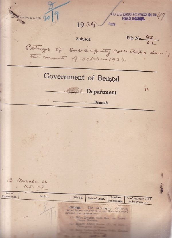 | Rack No. 02, Bundle No. 18, Sl No. 1076 Sanction of an officer for appointment as private secretary to H.E. The governor of Bengal. | Rack No. 02, Bundle No. 18, Sl No. 1077 Appointment of Capt. H.F.C. Armstrong as Additional S.P. Birbhum. | Rack No. 02, Bundle No. 18, Sl No. 1078 Grant of an advance from the G.P. Fund to Maulvi K.F. Quadir. S.D.C. Serajganj. | Rack No. 02, Bundle No. 18, Sl No. 1079 Postings of S.D.C. during the month October 1934. | Rack No. 02, Bundle No. 18, Sl No. 1080 Reposting of Mr. K.C. Chunder, As District & Sen Judge Khulna. | Rack No. 02, Bundle No. 18, Sl No. 1081 Instruction regarding the intermediate and final exam of candidates selected for the I.C.S. in 1933 & 34. | Rack No. 02, Bundle No. 18, Sl No. 1082 Report of the birth of a son to Mr. Santosh Kumar Chatasji, I.C.S. |