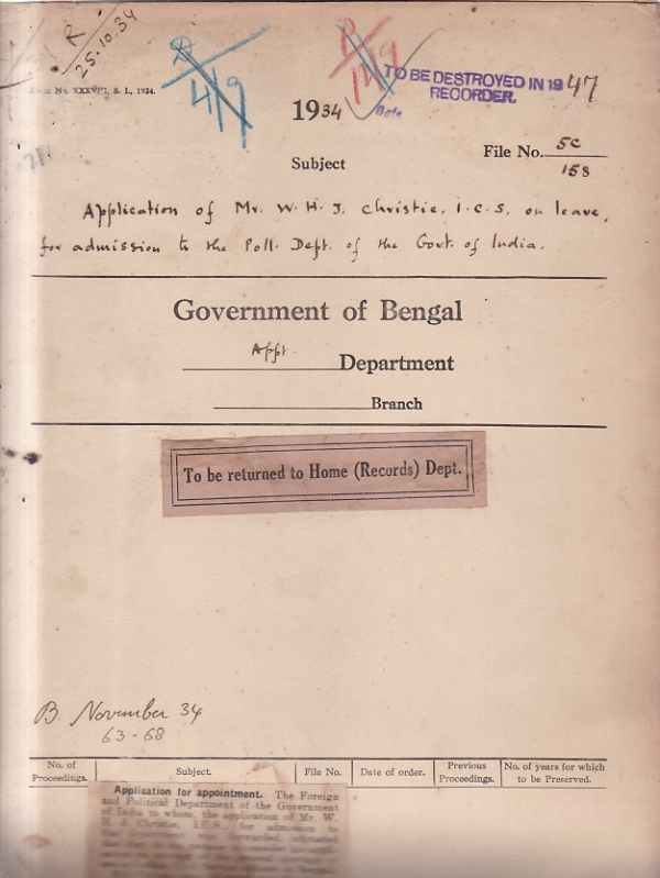 Application of Mr. W.H.J. Christies I.C.S. on leave, for admission to the Poll. Department of the Government of India.