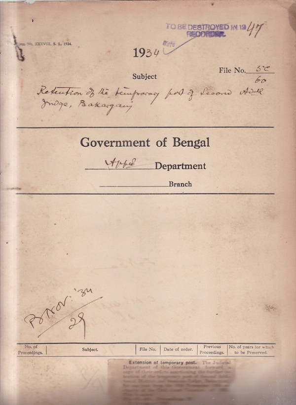 | Rack No. 02, Bundle No. 18, Sl No. 1093 Retention of the temporary post of Additional District & Session Judge Burdwan. | Rack No. 02, Bundle No. 18, Sl No. 1094 Amendment to the Regulations relating to the probation in the U.K. of Selected Candidates for the I.C.S. | Rack No. 02, Bundle No. 18, Sl No. 1095 Enquiry by the A/G of Bengal about the date of confirmation in a listed post of as I.C.S. Officer. | Rack No. 02, Bundle No. 18, Sl No. 1096 Retention of the temporary post of second Additional Judge, Bakarganj. | Rack No. 02, Bundle No. 18, Sl No. 1097 Representation of Aboriginal and Hill tribes in the Legislatures under the reformed constitution. | Rack No. 02, Bundle No. 18, Sl No. 1098 Recruitment of Muhammadans to the Calcutta Police Force. | Rack No. 02, Bundle No. 18, Sl No. 1099 Representation of Mr. L.H. Burton of the Indian police for exemption from percentage cut in pay. |