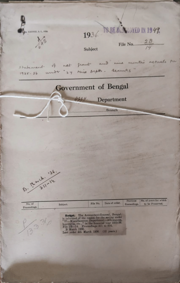 | Rack No. 2, Bundle No. 28, Sl No. 1619 Meetings between I.C.S. probationers at home and officers on leave. | Rack No. 2, Bundle No. 28, Sl No. 1620 House allowance of the rent Rs. 40 per month Chaplain fort William Calcutta. | Rack No. 2, Bundle No. 28, Sl No. 16203 Appointment of the Rev. T.G.C. devall as a Chaplain on probation in the I.E. Estt. | Rack No. 2, Bundle No. 28, Sl No. 1621 Number of figures on the provincial electoral rolls of the Bengal Legislative assembly. | Rack No. 2, Bundle No. 28, Sl No. 1622 Statement of the net grant and 9 months actual for 1935-36 under "37 Miscellaneous Department". | Rack No. 2, Bundle No. 28, Sl No. 1624 Joining time of Mr. Hem Chandra Sanyal Additional District Judge of Bakargonj. | Rack No. 2, Bundle No. 28, Sl No. 1625 Making over change of officer outside headquarters. |
