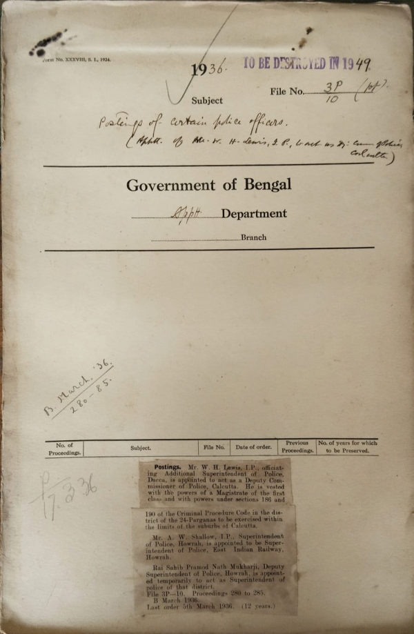 | Rack No. 2, Bundle No. 28, Sl No. 1625 Making over change of officer outside headquarters. | Rack No. 2, Bundle No. 28, Sl No. 1626 Requisition for an officer for Appointmentas Judicial commissioner of that province. | Rack No. 2, Bundle No. 28, Sl No. 1627 Forms of question naira for determination of domicile. | Rack No. 2, Bundle No. 28, Sl No. 1628 Honoraria for departmental exam in connection with the held in 1935. | Rack No. 2, Bundle No. 28, Sl No. 1629 Postings of certain police officers (Mr. W.H. Lewis I.P. as a D.C. of Police). | Rack No. 2, Bundle No. 28, Sl No. 1630 Birth report of a daughter to Mr. G. M. Radcliff I.C.S. officer, Dacca. | Rack No. 2, Bundle No. 28, Sl No. 1631 Application of the widow of the late Babu Akkil Chandra Ganguly S.D.C. for the grants of an extraordinary pension. |