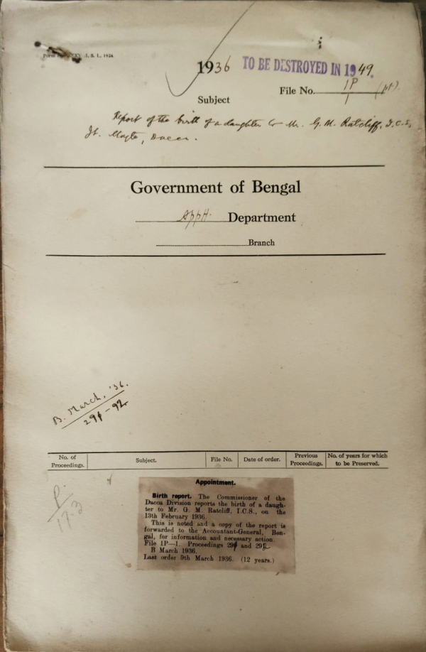 | Rack No. 2, Bundle No. 28, Sl No. 1626 Requisition for an officer for Appointmentas Judicial commissioner of that province. | Rack No. 2, Bundle No. 28, Sl No. 1627 Forms of question naira for determination of domicile. | Rack No. 2, Bundle No. 28, Sl No. 1628 Honoraria for departmental exam in connection with the held in 1935. | Rack No. 2, Bundle No. 28, Sl No. 1629 Postings of certain police officers (Mr. W.H. Lewis I.P. as a D.C. of Police). | Rack No. 2, Bundle No. 28, Sl No. 1630 Birth report of a daughter to Mr. G. M. Radcliff I.C.S. officer, Dacca. | Rack No. 2, Bundle No. 28, Sl No. 1631 Application of the widow of the late Babu Akkil Chandra Ganguly S.D.C. for the grants of an extraordinary pension. | Rack No. 2, Bundle No. 28, Sl No. 1632 Council resolution by R.K.C. Banarji Bahadur regarding the recruitment of Bengalese in filling appointment under the Government |