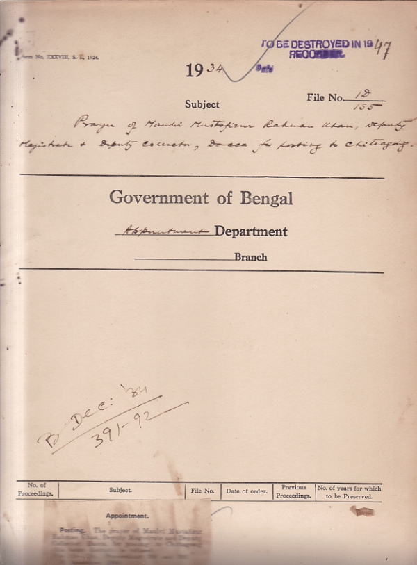 Payment of Maulvi M.R. Khan, Deputy Magistrate + Deputy Collector Dacca for posting to Chittagong