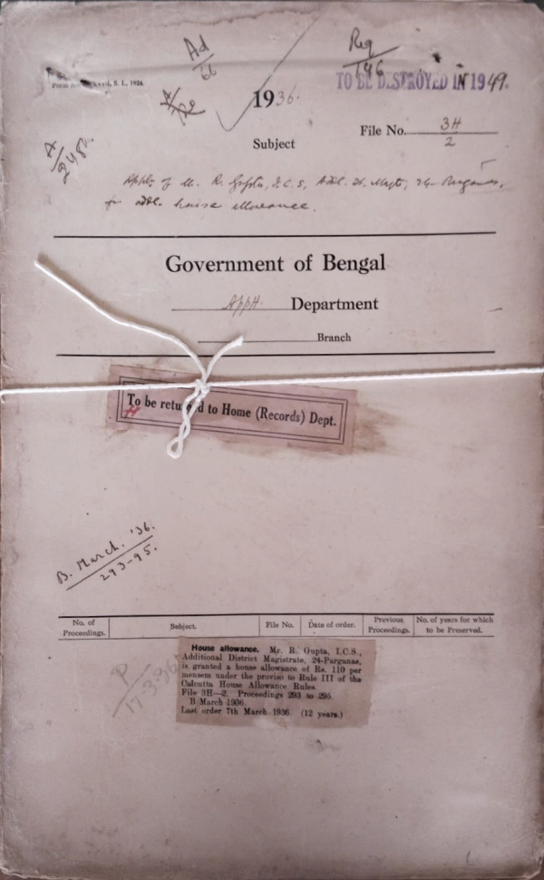 | Rack No. 2, Bundle No. 28, Sl No. 1631 Application of the widow of the late Babu Akkil Chandra Ganguly S.D.C. for the grants of an extraordinary pension. | Rack No. 2, Bundle No. 28, Sl No. 1632 Council resolution by R.K.C. Banarji Bahadur regarding the recruitment of Bengalese in filling appointment under the Government | Rack No. 2, Bundle No. 28, Sl No. 1633 Recruitment to the B.C.S. (Ex) and the B.G.C.S., 1935. | Rack No. 2, Bundle No. 28, Sl No. 1634 House allowance of MR. R. Gupta I.C.S. Additional District Magistrate. | Rack No. 2, Bundle No. 28, Sl No. 1635 Compulsory inculcation against enteric fever of all candidates for appointment. | Rack No. 2, Bundle No. 28, Sl No. 1636 Proposal for the grant of licenses to the Rev. F.W. Smith. | Rack No. 2, Bundle No. 28, Sl No. 1637 Necessity of obtaining passage certificates when applying of a passages. |