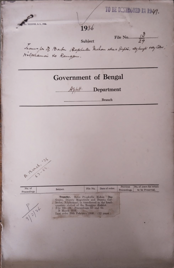 | Rack No. 2, Bundle No. 28, Sl No. 1646 Creation of a post in the political department and appointment there Mr. E.B. Baker I.C.S. | Rack No. 2, Bundle No. 28, Sl No. 1647 Verification of service before retirement. | Rack No. 2, Bundle No. 28, Sl No. 1648 Creation of a temporary post of special officer in the revenue department. | Rack No. 2, Bundle No. 28, Sl No. 1649 Transfer of Babu Phraphulla Mohan Das Goupta D. Magistrate and D. Collector to Rangpur. | Rack No. 2, Bundle No. 28, Sl No. 1650 Appointment of a special tribunal in Dinajpur. | Rack No. 2, Bundle No. 29, Sl No. 1651 Franchise qualifications for the provincial and Federal upper chamber. | Rack No. 2, Bundle No. 29, Sl No. 1652 Calcutta port trust Employee Association Permission to tender evidence before the Indian Delimitation committee. |