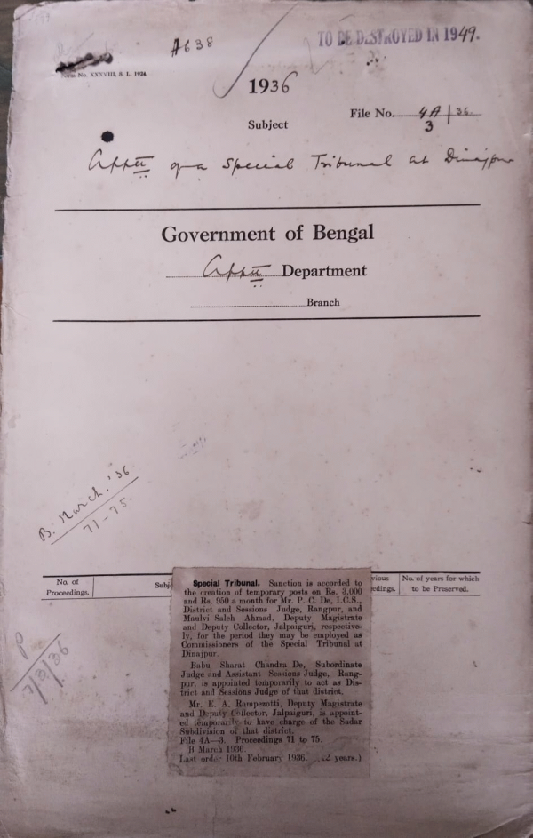 | Rack No. 2, Bundle No. 28, Sl No. 1647 Verification of service before retirement. | Rack No. 2, Bundle No. 28, Sl No. 1648 Creation of a temporary post of special officer in the revenue department. | Rack No. 2, Bundle No. 28, Sl No. 1649 Transfer of Babu Phraphulla Mohan Das Goupta D. Magistrate and D. Collector to Rangpur. | Rack No. 2, Bundle No. 28, Sl No. 1650 Appointment of a special tribunal in Dinajpur. | Rack No. 2, Bundle No. 29, Sl No. 1651 Franchise qualifications for the provincial and Federal upper chamber. | Rack No. 2, Bundle No. 29, Sl No. 1652 Calcutta port trust Employee Association Permission to tender evidence before the Indian Delimitation committee. | Rack No. 2, Bundle No. 29, Sl No. 1653 Method of voting to be employed for the elections in multimember constituencies of the provincial leg. Assembly. |