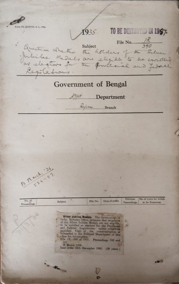 | Rack No. 2, Bundle No. 28, Sl No. 1648 Creation of a temporary post of special officer in the revenue department. | Rack No. 2, Bundle No. 28, Sl No. 1649 Transfer of Babu Phraphulla Mohan Das Goupta D. Magistrate and D. Collector to Rangpur. | Rack No. 2, Bundle No. 28, Sl No. 1650 Appointment of a special tribunal in Dinajpur. | Rack No. 2, Bundle No. 29, Sl No. 1651 Franchise qualifications for the provincial and Federal upper chamber. | Rack No. 2, Bundle No. 29, Sl No. 1652 Calcutta port trust Employee Association Permission to tender evidence before the Indian Delimitation committee. | Rack No. 2, Bundle No. 29, Sl No. 1653 Method of voting to be employed for the elections in multimember constituencies of the provincial leg. Assembly. | Rack No. 2, Bundle No. 29, Sl No. 1654 Relative representation of Urban and Rural areas in the provincial upper house and the council of state. |