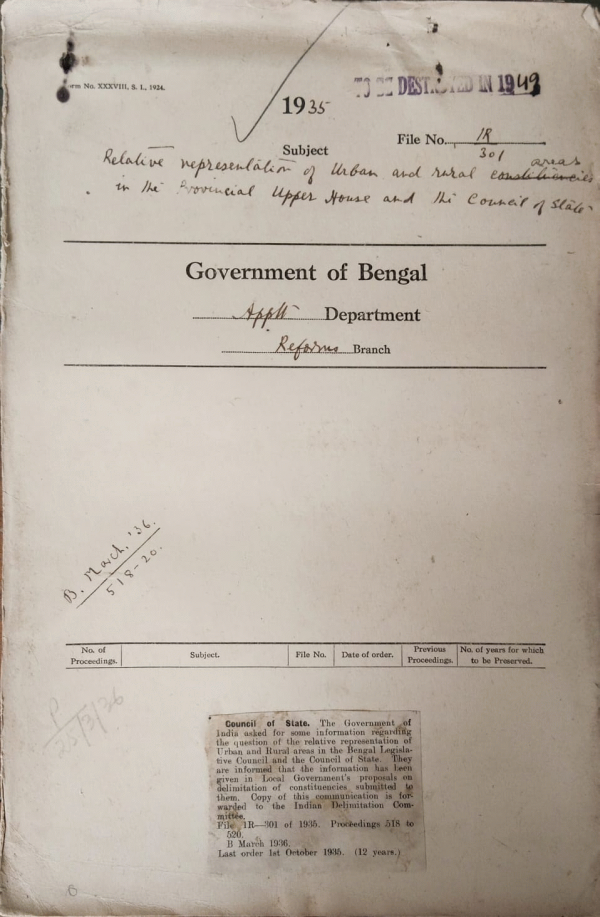| Rack No. 2, Bundle No. 29, Sl No. 1651 Franchise qualifications for the provincial and Federal upper chamber. | Rack No. 2, Bundle No. 29, Sl No. 1652 Calcutta port trust Employee Association Permission to tender evidence before the Indian Delimitation committee. | Rack No. 2, Bundle No. 29, Sl No. 1653 Method of voting to be employed for the elections in multimember constituencies of the provincial leg. Assembly. | Rack No. 2, Bundle No. 29, Sl No. 1654 Relative representation of Urban and Rural areas in the provincial upper house and the council of state. | Rack No. 2, Bundle No. 29, Sl No. 1655 Discriminator legislation by one province against goods manufactured in after province. | Rack No. 2, Bundle No. 29, Sl No. 1656 Complaints against the conduct of Mr. N. Raychaudhuri I.C.S. S.D.O. Jhargram Midnapore. | Rack No. 2, Bundle No. 29, Sl No. 1657 Pensioner liability of the Governmentof Bengal in respect of Major Fylde services as an A.D.C. to H.E. the general officers. |