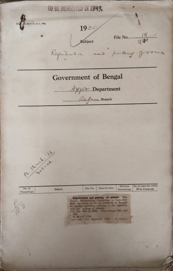 | Rack No. 2, Bundle No. 29, Sl No. 1659 Representation regarding the allocation of general and scheduled east's seats of the Bengal leg. Assembly. | Rack No. 2, Bundle No. 29, Sl No. 1660 Address to the presented to H.E. governor by the Dinajpur Anjuman. | Rack No. 2, Bundle No. 29, Sl No. 1661 Election of sterling accounts rules 1934 (Indi provident fund) by Merrs. J.R. Chitham and Mr. W. J. Jame son two new London I. P. Recruited. | Rack No. 2, Bundle No. 29, Sl No. 1662 Registration and polling of women. | Rack No. 2, Bundle No. 29, Sl No. 1663 Questionnaire of the secretariat committee. | Rack No. 2, Bundle No. 29, Sl No. 1664 Rotations from détentes forego of their names in the Electoral Rolls under the new constitution. | Rack No. 2, Bundle No. 29, Sl No. 1665 Action to the taken under various section of the Governmentand India Act, 1935 in connection with the introduction of the provincial Autonomy. |