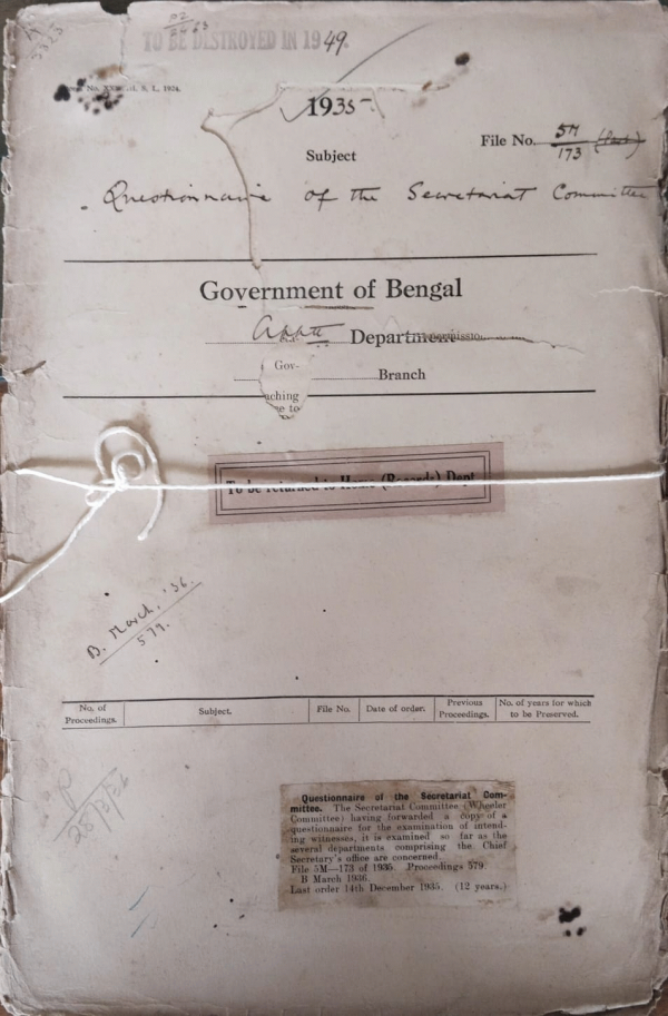 | Rack No. 2, Bundle No. 29, Sl No. 1660 Address to the presented to H.E. governor by the Dinajpur Anjuman. | Rack No. 2, Bundle No. 29, Sl No. 1661 Election of sterling accounts rules 1934 (Indi provident fund) by Merrs. J.R. Chitham and Mr. W. J. Jame son two new London I. P. Recruited. | Rack No. 2, Bundle No. 29, Sl No. 1662 Registration and polling of women. | Rack No. 2, Bundle No. 29, Sl No. 1663 Questionnaire of the secretariat committee. | Rack No. 2, Bundle No. 29, Sl No. 1664 Rotations from détentes forego of their names in the Electoral Rolls under the new constitution. | Rack No. 2, Bundle No. 29, Sl No. 1665 Action to the taken under various section of the Governmentand India Act, 1935 in connection with the introduction of the provincial Autonomy. | Rack No. 2, Bundle No. 29, Sl No. 1666 Acceptance of a horoscope or affidavit as proof of age for appearing at the B.C.S. examination. |
