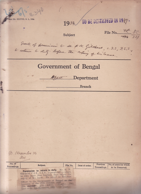| Rack No. 02, Bundle No. 19, Sl No. 1119 Recruitment for the I.C.S. in 1934-35 (Allotment). | Rack No. 02, Bundle No. 19, Sl No. 1120 First Class powers of Babu Shashanka Sekhar Chaudhuri Deputy Magistrate & Deputy Collector. | Rack No. 02, Bundle No. 19, Sl No. 1121 Second half-yearly Departmental Examination of Assistant Magistrates and others to be held in Nov. 1934. | Rack No. 02, Bundle No. 19, Sl No. 1122 Grant of permission to Mr. R.N. Gil chartist, C.I.E., I.E.S. to return to duty before the expiry of his leave. | Rack No. 02, Bundle No. 19, Sl No. 1123 Application of Mulvi Mazharul Islam, Deputy Magistrate & Deput Collector, Bakarganj, for an advance from the G.P.F. | Rack No. 02, Bundle No. 19, Sl No. 1124 Second class powers of Babu Suresh Chandra Das Gupta on Probation Deputy Magistrate & Deputy Collector. | Rack No. 02, Bundle No. 19, Sl No. 1125 Replacement of Deputy S.P. of Police by Inspectors at the Headquarters Station of Certain districts. |