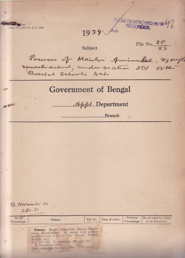 Powers of Mulvi Aminullah Deputy Magistrate, Murshidabad under section 5 (1) of the Bengal Borstal Schools Act.