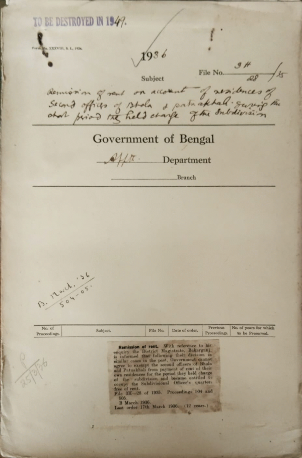 | Rack No. 2, Bundle No. 29, Sl No. 1680 Relaxation of the rule regarding age limits of candidates for admission to the B.C.S. examination (Babu Monoranjan Das). | Rack No. 2, Bundle No. 29, Sl No. 1681 Bye-election in the Indian Jute Mills association constituency of the Bengal legislative council Mr. C.G. Cooper resigned. | Rack No. 2, Bundle No. 29, Sl No. 1682 Application of Sreemati Bijali Bala Sen widow of late Mr. P. Sen. District Collectorate for pension from the silver wedding fund. | Rack No. 2, Bundle No. 29, Sl No. 1683 Remission of rent. | Rack No. 2, Bundle No. 29, Sl No. 1684 Occupation of the Munsiffs quarters at Nilphamari by the Circle officer of Nilphamari in Rangpur. | Rack No. 2, Bundle No. 29, Sl No. 1685 Visit of H.E. the governor to Burma. | Rack No. 2, Bundle No. 29, Sl No. 1686 Block in promotion to the election grade of senior superintendent of Police. |