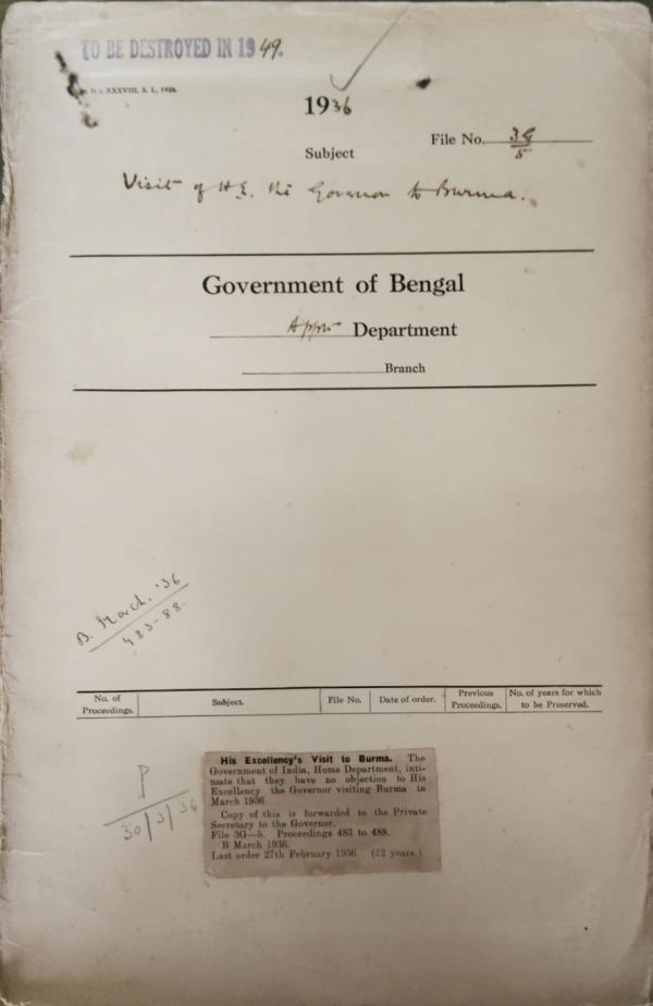 | Rack No. 2, Bundle No. 29, Sl No. 1682 Application of Sreemati Bijali Bala Sen widow of late Mr. P. Sen. District Collectorate for pension from the silver wedding fund. | Rack No. 2, Bundle No. 29, Sl No. 1683 Remission of rent. | Rack No. 2, Bundle No. 29, Sl No. 1684 Occupation of the Munsiffs quarters at Nilphamari by the Circle officer of Nilphamari in Rangpur. | Rack No. 2, Bundle No. 29, Sl No. 1685 Visit of H.E. the governor to Burma. | Rack No. 2, Bundle No. 29, Sl No. 1686 Block in promotion to the election grade of senior superintendent of Police. | Rack No. 2, Bundle No. 29, Sl No. 1687 Purchase of a raw racks and whatnots for the Reforms section. | Rack No. 2, Bundle No. 29, Sl No. 1688 Application of Maulvi Tofazzal Hossain Mia, Proby Clerk in the Pirojpur Munsiffs Court for permission to appear at the B.C.S. Examination. |