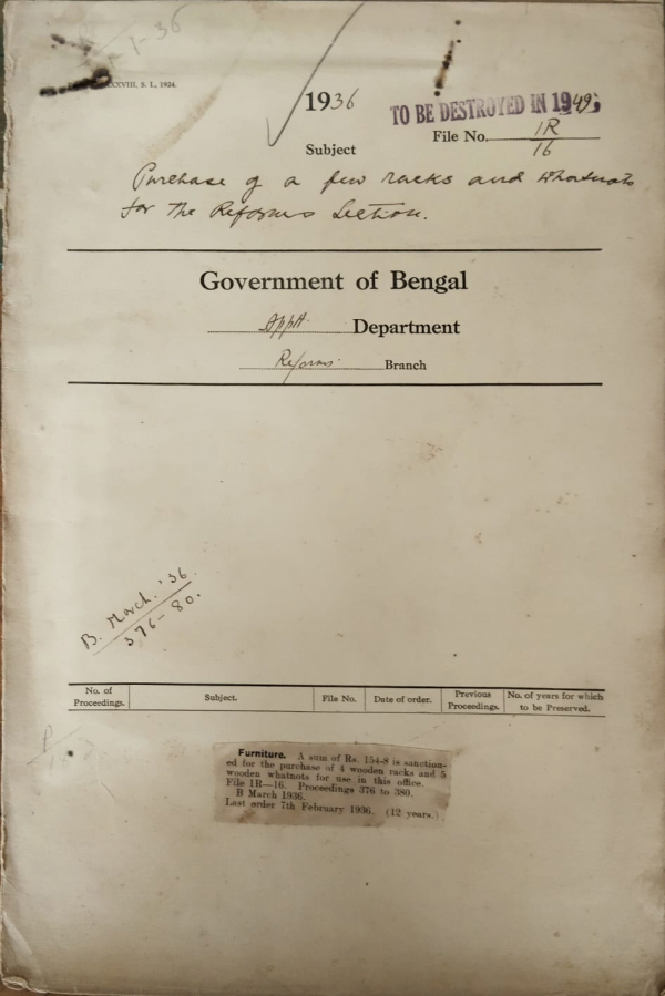 | Rack No. 2, Bundle No. 29, Sl No. 1684 Occupation of the Munsiffs quarters at Nilphamari by the Circle officer of Nilphamari in Rangpur. | Rack No. 2, Bundle No. 29, Sl No. 1685 Visit of H.E. the governor to Burma. | Rack No. 2, Bundle No. 29, Sl No. 1686 Block in promotion to the election grade of senior superintendent of Police. | Rack No. 2, Bundle No. 29, Sl No. 1687 Purchase of a raw racks and whatnots for the Reforms section. | Rack No. 2, Bundle No. 29, Sl No. 1688 Application of Maulvi Tofazzal Hossain Mia, Proby Clerk in the Pirojpur Munsiffs Court for permission to appear at the B.C.S. Examination. | Rack No. 2, Bundle No. 29, Sl No. 1689 Permission to the P.S. Chaplain to Sell furniture. | Rack No. 2, Bundle No. 29, Sl No. 1690 Summary powers of Babu Kshirode Bihari Mullik Deputy Magistrate Birbhum. |
