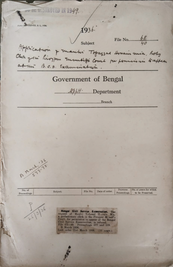Application of Maulvi Tofazzal Hossain Mia, Proby Clerk in the Pirojpur Munsiffs Court for permission to appear at the B.C.S. Examination.