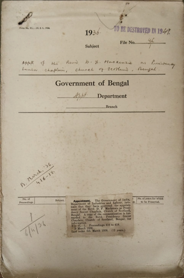 Appointment of the Rev. D. F. Mackenzie as presidency Senior Chaplain Church of Scotland, Bengal