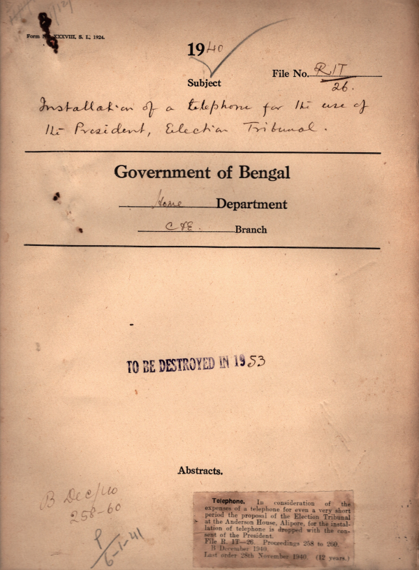 | Rack No. 08, Bundle No. 18; SI No. 1100 Terms of service of Civil govt. Servants granted emergency commissions in his Majesty’s land forces | Rack No. 08, Bundle No. 18; SI No. 1101 Council question by M. Shamsuzzoha, M.L.C. regarding the appointment of a tribunal for the trial Petition. | Rack No. 08, Bundle No. 18; SI No. 1102 Corrigenda to the list of authorities responsible for control of expenditure. | Rack No. 08, Bundle No. 18; SI No. 1103 Installation of a telephone for the use of the president, Election Tribunal. | Rack No. 08, Bundle No. 18; SI No. 1104 Assembly resolution by Maulvi A. Hamid Shah regarding the proposed recognition of Bengal as a separate dominion. | Rack No. 08, Bundle No. 18; SI No. 1105 Amendments to the Darjeeling code rules. | Rack No. 08, Bundle No. 18; SI No. 1106 East Protection against noise during air raids. |