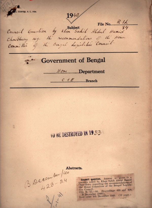 Council question by Khan Sihib Abdul Hamid Chowdhury recommendation of the house committee of the B.L.C.