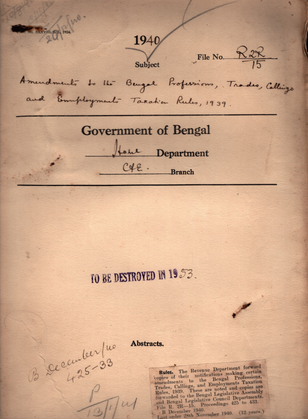 | Rack No. 08, Bundle No. 18; SI No. 1106 East Protection against noise during air raids. | Rack No. 08, Bundle No. 18; SI No. 1107 Amendment to the treasury rules, Bengal and Subsidiary rules. | Rack No. 08, Bundle No. 18; SI No. 1108 Council question by Khan Sihib Abdul Hamid Chowdhury recommendation of the house committee of the B.L.C. | Rack No. 08, Bundle No. 18; SI No. 1109 Amendments to the Bengal professions, Trades callings and Employments taxation Rules, 1939. | Rack No. 08, Bundle No. 18; SI No. 1110 Final payment in Sterling of the Sum at the Credit of Subscribers govt. by Superior Civil Service. | Rack No. 08, Bundle No. 18; SI No. 1111 The Bengal rural primary education Bill, 1940, by Maqbul Hossain, M.L.A. | Rack No. 08, Bundle No. 18; SI No. 1112 Application from Rai S.K.B. Das, M.L.A. Scheduled caste electoral rolls of the district. |
