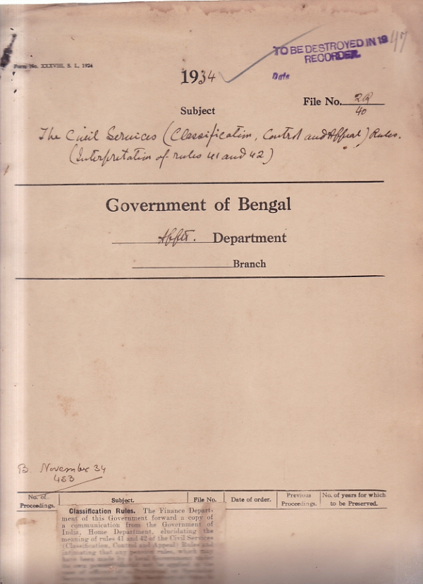 | Rack No. 02, Bundle No. 19, Sl No. 1136 Summary powers of Babu Prafulla Mohan Das Gupta, Deputy Magistrate, Rangpur. | Rack No. 02, Bundle No. 19, Sl No. 1137 Rate of interest on house building, motor Car and other advances for 1934-35. | Rack No. 02, Bundle No. 19, Sl No. 1138 Rules relating to grant from the compassionate gratuity Fund, Bengal. | Rack No. 02, Bundle No. 19, Sl No. 1139 The Civil service Rules. | Rack No. 02, Bundle No. 19, Sl No. 1140 Acting Promotion to the Selection of Superintendent of Police. | Rack No. 02, Bundle No. 19, Sl No. 1141 Amount of invalid pension of Babu Phani Lal Mukherji, Sub. Deputy Collector. | Rack No. 02, Bundle No. 19, Sl No. 1142 Appointment of Babu Shayamananda Beanrji, Sub-Deputy Collector as Registrar, Police Courts, Calcutta. |