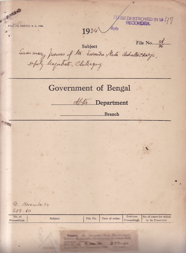 | Rack No. 02, Bundle No. 19, Sl No. 1142 Appointment of Babu Shayamananda Beanrji, Sub-Deputy Collector as Registrar, Police Courts, Calcutta. | Rack No. 02, Bundle No. 19, Sl No. 1143 Grant of motor car advance to the Rev. E.I. Young, Chaplain of Barrackpore. | Rack No. 02, Bundle No. 19, Sl No. 1144 The Bengal Service Rules, 1934. | Rack No. 02, Bundle No. 19, Sl No. 1145 Summary powers of Mr. Surendra Nath Chatterji, Deputy -Magistrate, Chittagong. | Rack No. 02, Bundle No. 19, Sl No. 1146 Examination of Medical officers in Vernacular. | Rack No. 02, Bundle No. 19, Sl No. 1147 Summary powers of Mr. P.N. Mc William, I.C.S. S.D.O., Contain, Midnapore. | Rack No. 02, Bundle No. 19, Sl No. 1148 Placing of Services of Mr. K.A.L. Hill, I.C.S. of the disposal of the Rev. Department. |