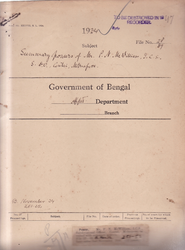 Summary powers of Mr. P.N. Mc William, I.C.S. S.D.O., Contain, Midnapore.