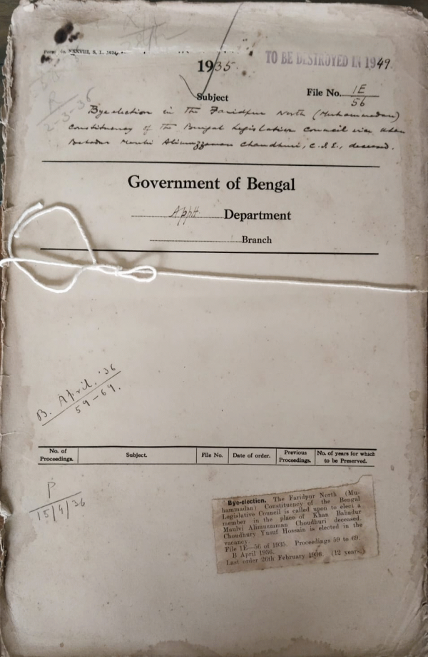 | Rack No. 2, Bundle No. 29, Sl No. 1699 Relaxation of the rule District age limit of candidates for admission with B.C.S. Examination. | Rack No. 2, Bundle No. 29, Sl No. 1700 Duration of electoral rolls and agency for preparation of rolls under the Reformed constitution. | Rack No. 2, Bundle No. 30, Sl No. 1701 Reorganization of the Bengal Legislative Council Department due to the introduction of the new constitution. | Rack No. 2, Bundle No. 30, Sl No. 1702 Bye-election in the Faridpur North (Muhammadan) Constituency, Council. | Rack No. 2, Bundle No. 30, Sl No. 1703 Memorandum Containing the proposals of the local Governmenton delimitation of constituency for the Bengal Legislative Assembly. | Rack No. 2, Bundle No. 30, Sl No. 1704 Establishment of trade union Constituencies. | Rack No. 2, Bundle No. 30, Sl No. 1705 Expenditure in connection with the bye-election in the Burdhawan & Presidency Divisions (Muhmmadan Rural) Constituency of the Legislative Assembly. |