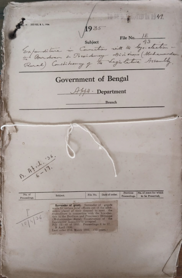 | Rack No. 2, Bundle No. 30, Sl No. 1702 Bye-election in the Faridpur North (Muhammadan) Constituency, Council. | Rack No. 2, Bundle No. 30, Sl No. 1703 Memorandum Containing the proposals of the local Governmenton delimitation of constituency for the Bengal Legislative Assembly. | Rack No. 2, Bundle No. 30, Sl No. 1704 Establishment of trade union Constituencies. | Rack No. 2, Bundle No. 30, Sl No. 1705 Expenditure in connection with the bye-election in the Burdhawan & Presidency Divisions (Muhmmadan Rural) Constituency of the Legislative Assembly. | Rack No. 2, Bundle No. 30, Sl No. 1706 Employment of Sub-Deputy Collectors in Jute and stamps work. | Rack No. 2, Bundle No. 30, Sl No. 1707 Drafting of Bengal legislative Assembly Electoral Rules. | Rack No. 2, Bundle No. 30, Sl No. 1708 Amendments to the Bengal Passage Rules, 1927. |