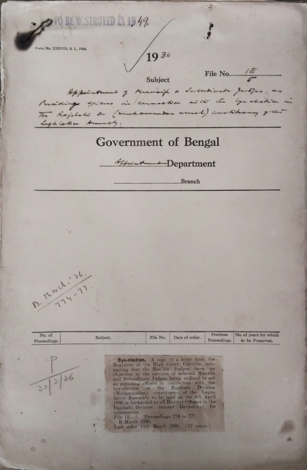 | Rack No. 2, Bundle No. 30, Sl No. 1711 Channel of correspondence between the local Government and the secretary of State under the new constitution. | Rack No. 2, Bundle No. 30, Sl No. 1712 Representation of Calcutta Corporation laborers in the Bengal Legislative Assembly under the reformed constitution. | Rack No. 2, Bundle No. 30, Sl No. 1713 Enquire by the A.G. Bengal about acting appointment made in the place of Mr. A. Hughps. I.C.S. | Rack No. 2, Bundle No. 30, Sl No. 1714 Appointment of Munsifs and Subordinate Judges as Presiding officers in the last General Election to the Legislative Assembly. | Rack No. 2, Bundle No. 30, Sl No. 1715 Transfer of Services of the Revd. D.H. Mukherji at the disposal of the Bengal Government | Rack No. 2, Bundle No. 30, Sl No. 1716 Budget estimate of the Chiristion Burial Board for 1936-37. | Rack No. 2, Bundle No. 30, Sl No. 1717 Nomination of official members to the Bengal Legislative council. |