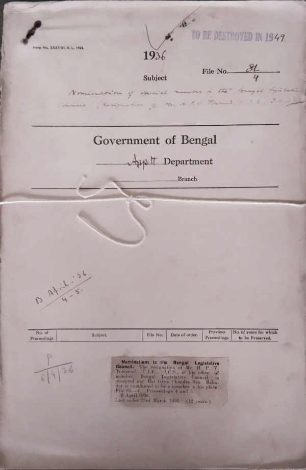 | Rack No. 2, Bundle No. 30, Sl No. 1713 Enquire by the A.G. Bengal about acting appointment made in the place of Mr. A. Hughps. I.C.S. | Rack No. 2, Bundle No. 30, Sl No. 1714 Appointment of Munsifs and Subordinate Judges as Presiding officers in the last General Election to the Legislative Assembly. | Rack No. 2, Bundle No. 30, Sl No. 1715 Transfer of Services of the Revd. D.H. Mukherji at the disposal of the Bengal Government | Rack No. 2, Bundle No. 30, Sl No. 1716 Budget estimate of the Chiristion Burial Board for 1936-37. | Rack No. 2, Bundle No. 30, Sl No. 1717 Nomination of official members to the Bengal Legislative council. | Rack No. 2, Bundle No. 30, Sl No. 1718 Bengal civil service examination. | Rack No. 2, Bundle No. 30, Sl No. 1719 Relaxation of the rule regarding age limits of candidates for admission to the B.C.S., Examination. |