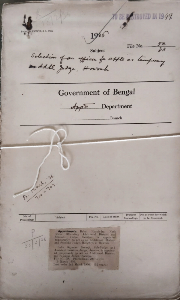| Rack No. 2, Bundle No. 30, Sl No. 1720 Provision for the raising of wall of the Bhowanipore Military Cemetery. | Rack No. 2, Bundle No. 30, Sl No. 1721 Appointment of Rai Sahib Akhay Kumar Datta a retired inspector of Police. | Rack No. 2, Bundle No. 30, Sl No. 1722 Appointment of Major T. Woodcock Commandant of the Detention Camp. Berhampore Murshidabad. | Rack No. 2, Bundle No. 30, Sl No. 1723 Selection of officers for Appointment as temporary Additional Judge, Howrah. | Rack No. 2, Bundle No. 30, Sl No. 1724 Rules for grants from the compassionate Fund. | Rack No. 2, Bundle No. 30, Sl No. 1725 Appointment of Mr. H. J. Twynam, C.I.E. & I.C.S. as commissioner of the Presidency Division. | Rack No. 2, Bundle No. 30, Sl No. 1726 Variations in the rate of P.F. Subscription during the currency of the Cut of pay. |