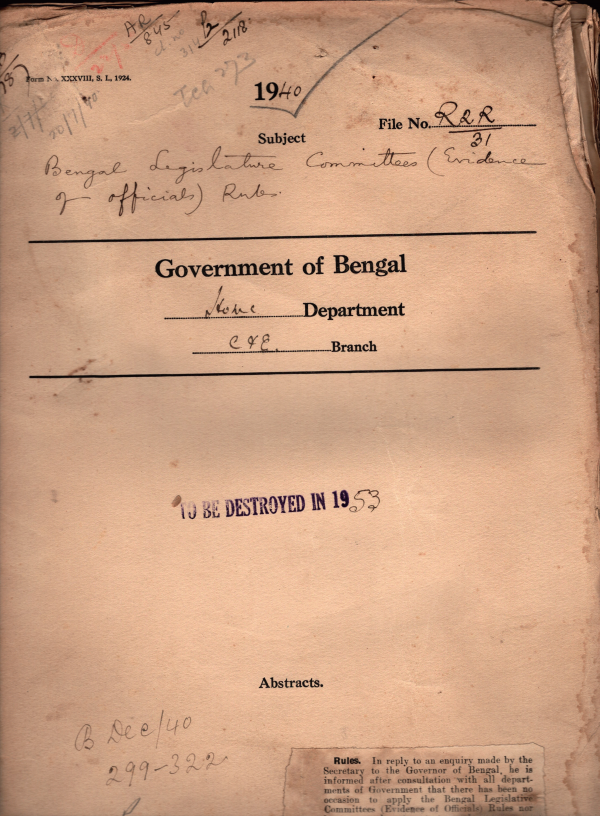 | Rack No. 08, Bundle No. 18; SI No. 1120 By-election in the Burdwan D.L.C. of the B.L.C. in place of R. Scotson resigned. | Rack No. 08, Bundle No. 18; SI No. 1121 Petition from Babu Pretulch Ganguli, M.L.A. a Security pension. | Rack No. 08, Bundle No. 18; SI No. 1122 Rules under the Bengal Finance Act, 1939. | Rack No. 08, Bundle No. 18; SI No. 1123 Bengal legislative committees of rules. | Rack No. 08, Bundle No. 18; SI No. 1124 Assent of H.E. the governor to the Bengal Patni Taluks regulation Bill, 1940. | Rack No. 08, Bundle No. 18; SI No. 1125 Rules of business under Section 59 of the govt. of Indian Act, 1935. | Rack No. 08, Bundle No. 18; SI No. 1126 Assent of H.E. the governor to the Bengal Shops and establishments Bill, 1940. |