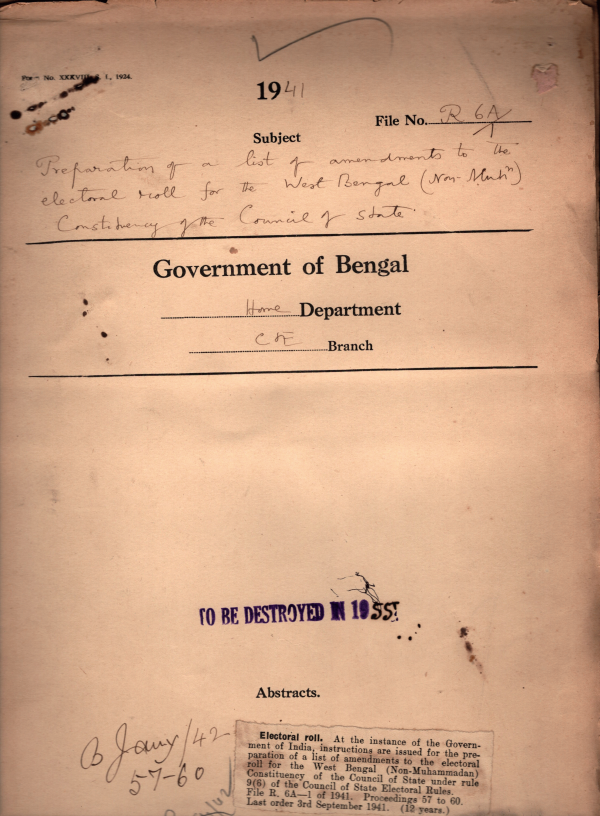 | Rack No. 08, Bundle No. 18; SI No. 1130 Payment of conveyance to Certain menials of the B.L.A. Department for late hours night work. | Rack No. 08, Bundle No. 18; SI No. 1131 By-election in the North Bengal municipal general constituency of the assembly. | Rack No. 08, Bundle No. 18; SI No. 1132 Views of P.S.C. regarding the election of Candidates for appointment as Secretary Assistant Secretary and registrar of the B.L.C. | Rack No. 08, Bundle No. 18; SI No. 1133 Preparation of a list of amendment to the electoral roll for the West Bengal, Constituency of the Council of State | Rack No. 08, Bundle No. 18; SI No. 1134 Statement of grant on appropriation and expenditure under grant no. 12 General admin. | Rack No. 08, Bundle No. 18; SI No. 1135 Resolution passed at the 2nd Session of the Murshidabad district Scheduled Caste Conference. | Rack No. 08, Bundle No. 18; SI No. 1136 Proceedings of the Central Legislature. |