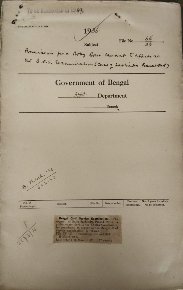 | Rack No. 2, Bundle No. 30, Sl No. 1726 Variations in the rate of P.F. Subscription during the currency of the Cut of pay. | Rack No. 2, Bundle No. 30, Sl No. 1727 Appointment of Mr. J.D. Tyson, C.B.E. I.C.S. as an Adviser to H.H. the Maharaja of Coach Behar. | Rack No. 2, Bundle No. 30, Sl No. 1728 Supply of information regarding the B.C.S. Examination. | Rack No. 2, Bundle No. 30, Sl No. 1729 Permission for a proby. Government Servant to appear at the Bengal Civil Service Examination. | Rack No. 2, Bundle No. 30, Sl No. 1730 Recovery of proportionate share of local taxes for the occupation of Railway Buildings. | Rack No. 2, Bundle No. 30, Sl No. 1731 Grant of Deputy leave to Mr. T.B. Jameson, I.C.S. | Rack No. 2, Bundle No. 30, Sl No. 1732 Final withdrawal from the G.P.F. |