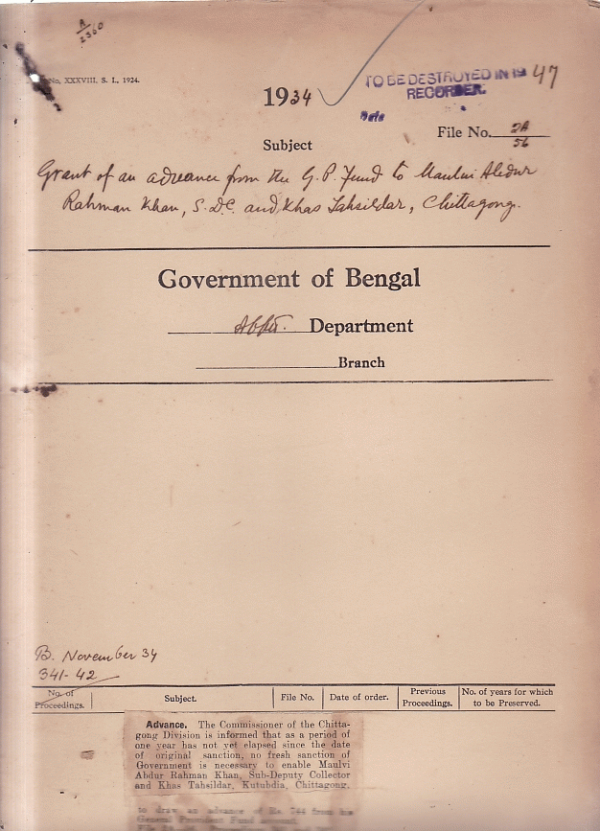 Grant of an advance from the G.P.F. Mulvi Abedur Rahman Khan S.D.C. and Khas Tahsildar, Chittagong.