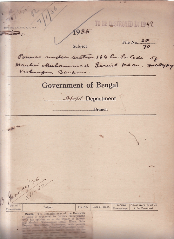 Powers under Section 164 Criminal Procedure Code of Mulvi Muhammad Israil Khan, Sub-Deputy Magistrate. Vishnupur, Bankura.