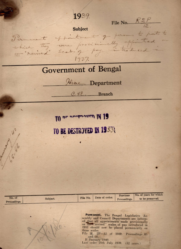| Rack No. 08, Bundle No. 10, SI No. 604 Telegrams addressed to unregistered abbreviated address of Govt. officials. | Rack No. 08, Bundle No. 10, SI No. 605 Changes for additional in the Bengal Telephone Corporation Directory. | Rack No. 08, Bundle No. 10, SI No. 606 Revision of pay scales. | Rack No. 08, Bundle No. 10, SI No. 607 Permanent appointment made of persons to posts to which they were Provisionally on the revised scales of pay introduces in 1937. | Rack No. 08, Bundle No. 10, SI No. 608 Exchange of Rules & Bills between the govt. of Bombay & Bengal on reciprocal basis. | Rack No. 08, Bundle No. 10, SI No. 609 Grant of extension of service. | Rack No. 08, Bundle No. 10, SI No. 610 Preparation of electoral rolls for the Labour Constituency of the Calcutta Corporation. |