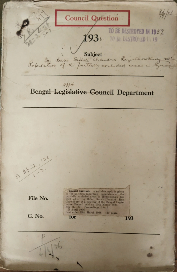 C.Q. by Babu Sutish Chandra Roy Chaudhury regarding Population of the Partially excluded areas in Mymensingh.