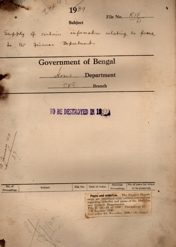 | Rack No. 08, Bundle No. 10, SI No. 614 Expenditure in connection with the by-election Dacca East (Rural) general constituency of the B.L.A. | Rack No. 08, Bundle No. 10, SI No. 615 Amendments to the Treasury Rules, Bengal & the Subsidiary Rule made there under. | Rack No. 08, Bundle No. 10, SI No. 616 Proposal for the conversion of the existing tables in committee room of the Bengal Legislative Building into a Sectional oval table. | Rack No. 08, Bundle No. 10, SI No. 617 Supply of certain information relating to peons to the finance Department. | Rack No. 08, Bundle No. 10, SI No. 618 Payment of bills for arrangement in connection with Cabinet Meetings al Darjeeling. | Rack No. 08, Bundle No. 10, SI No. 619 Representation of Buddhists in the Legislature. | Rack No. 08, Bundle No. 10, SI No. 620 Assembly Resolution by Mr. Abdul Wahab Khan, M.L.A. regarding future constitution of India. |